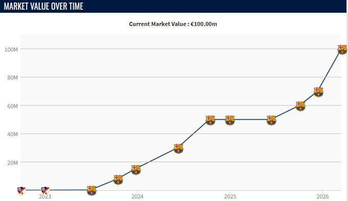 本赛季刚开始的时候,费尔明的身价是5000万欧元,随后在去年10月,他的身价上涨了1000万欧元,达到了6000万欧元,12月,他的身价再次上涨1000万欧,达到了7000万欧元。