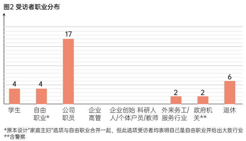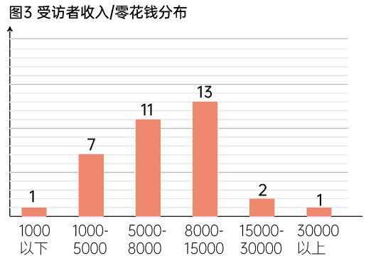 受访者收入呈正态分布,月收入5000-8000元和8000-15000元为主要群体,分别为11人(31.4%)和13人(37.1%)。其中5000-8000元受访者中有3人退休,其余8位受访者(4位自由职业)工资偏8000元区间;选择8000-15000元的受访者全部为公司职员,工资偏向10000元。(图3)