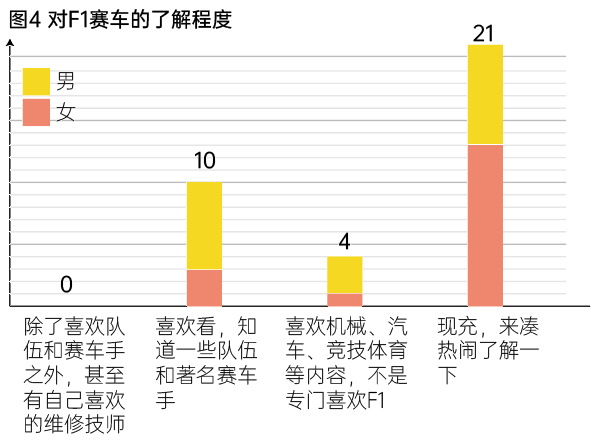 在剩余40%爱好者中,普通爱好者占到了3/4。所有人的爱好上限均卡在喜欢看比赛、关注一些明星赛车手,但对明星技师或车队的发展连续性并不了解(10人/28.6%)。