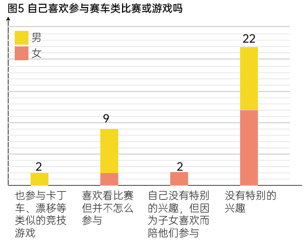 9人(25.7%,女2男7)也不会参与卡丁车、漂移等竞速或竞技游戏。仅有的两个又喜欢看比赛又愿意参与的受访者均为男性,而且与职业和爱好紧密相关:一位是警察,另一位是深度户外爱好者。徐汇西岸的受访者中也有2人提出“有可能深度了解的爱好者都在嘉定吧,滨江分会场都是路人粉”。(图5)