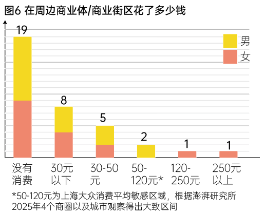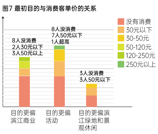 如果以三大前往目的(商业、活动、景观)看受访者的消费能力,可以发现高目的性活动对周边商业的连带效率并不高,哪怕在徐汇西岸也属个案。三大目的中均有半数左右不消费,其中以商业为目的但没有消费的人比例高于50%(8人/61.5%),消费人群两极分化,缺少30-50元群体。(图7)